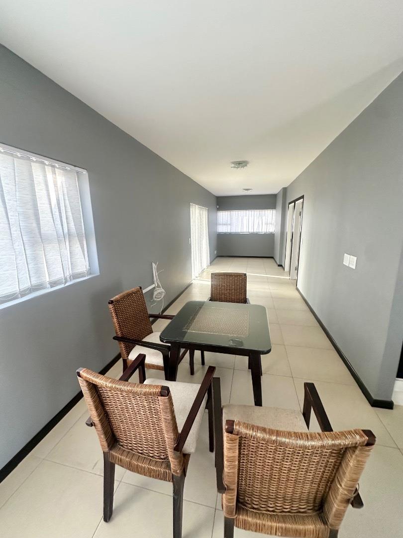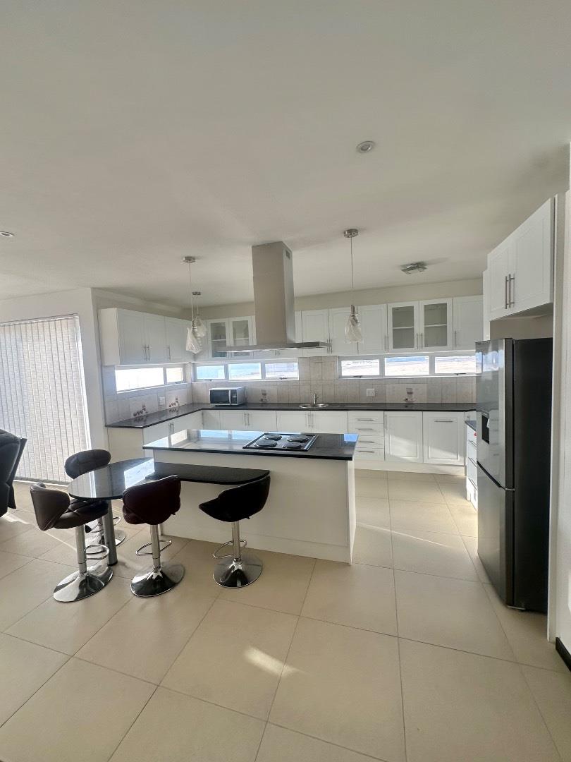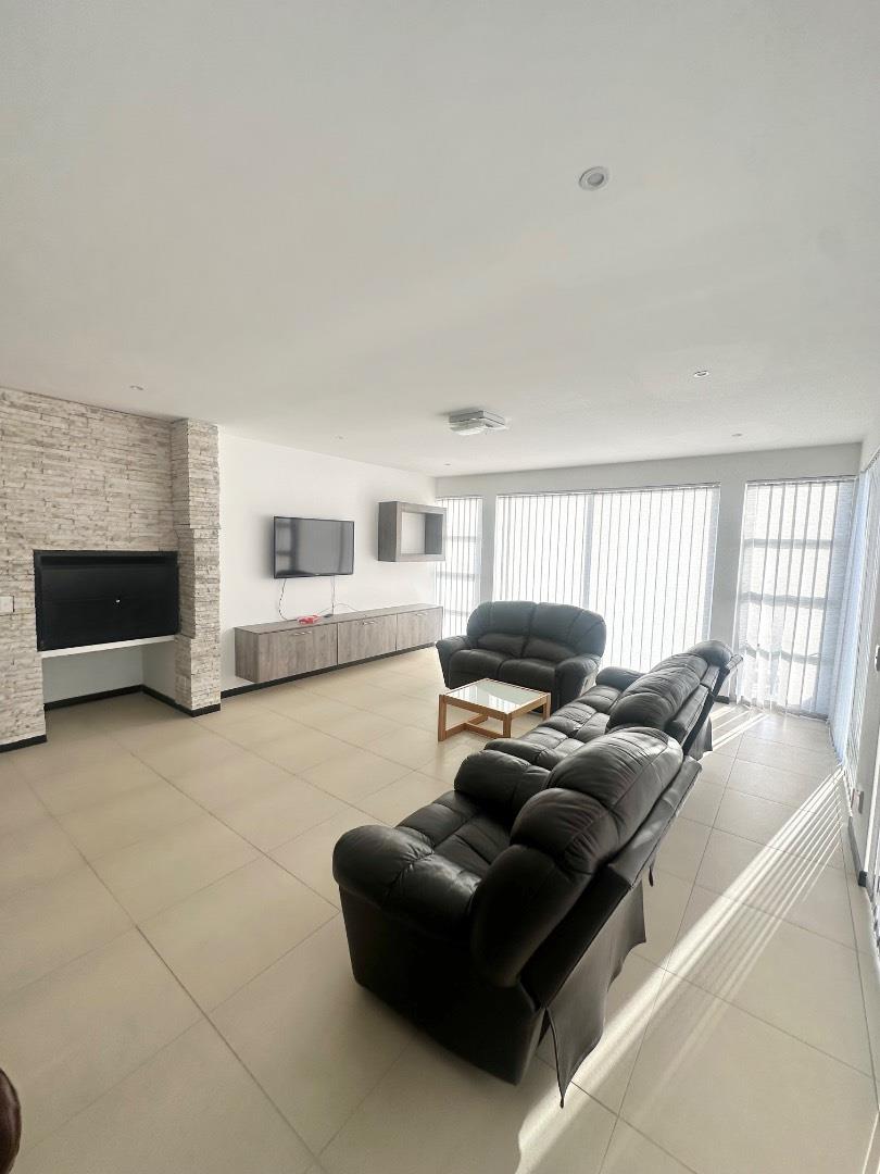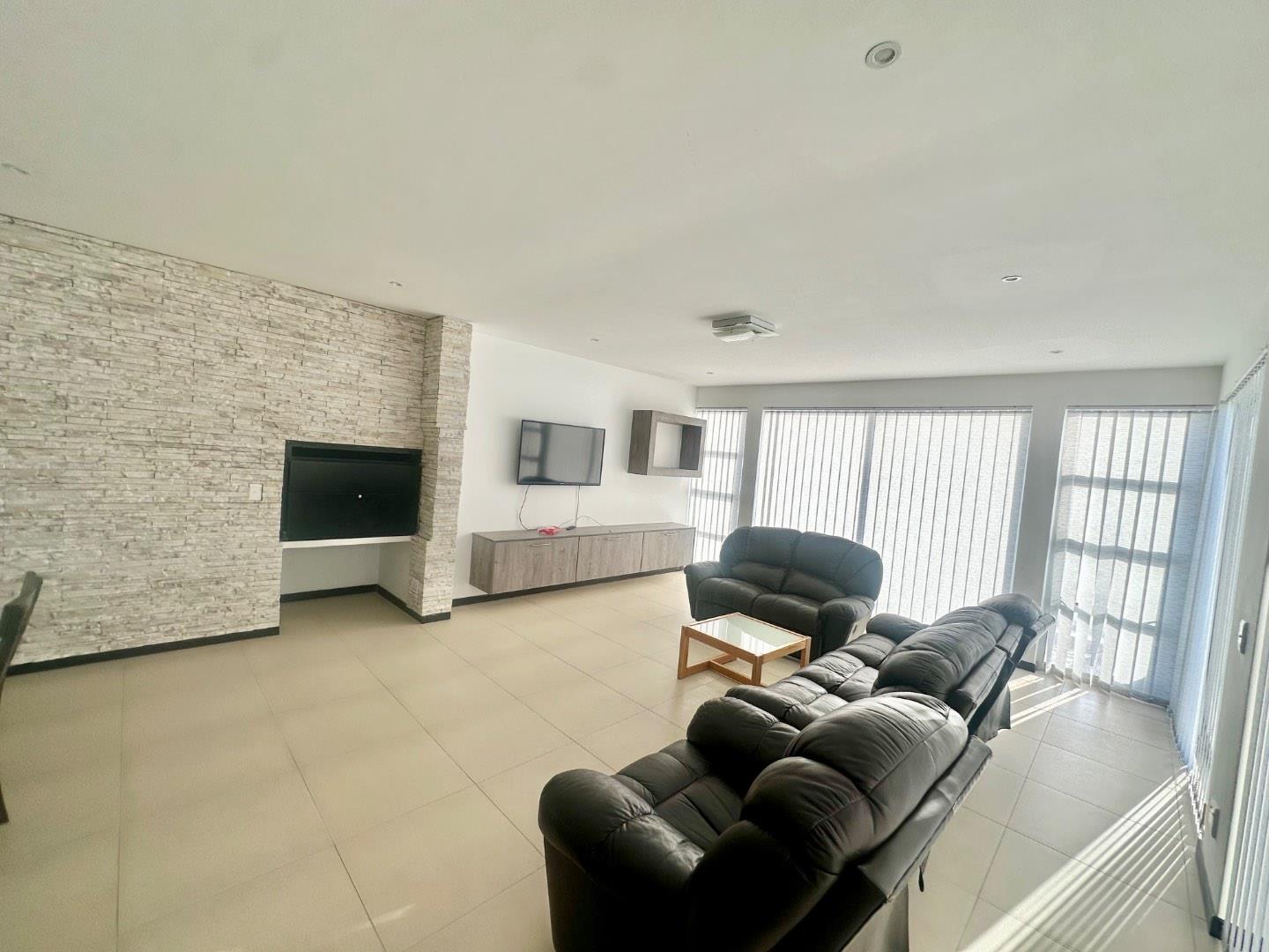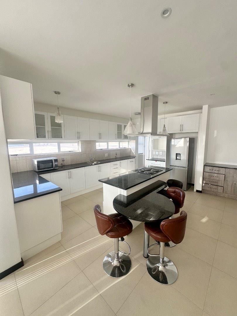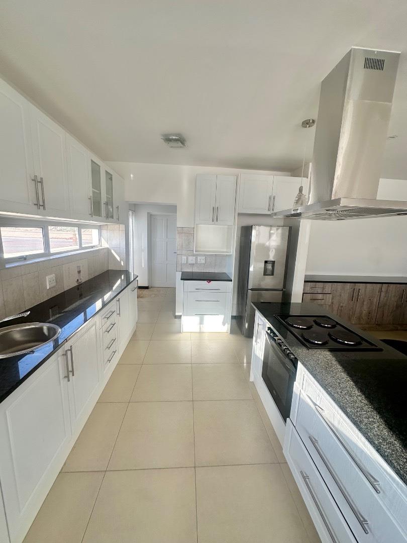 The home features a beautiful open-plan layout, including a modern kitchen fitted with sleek marble countertops, ample cabinetry, and a separate scullery for added convenience. The dining area is enhanced by a built-in indoor BBQ and additional fitted cupboards, creating a perfect space for entertaining.